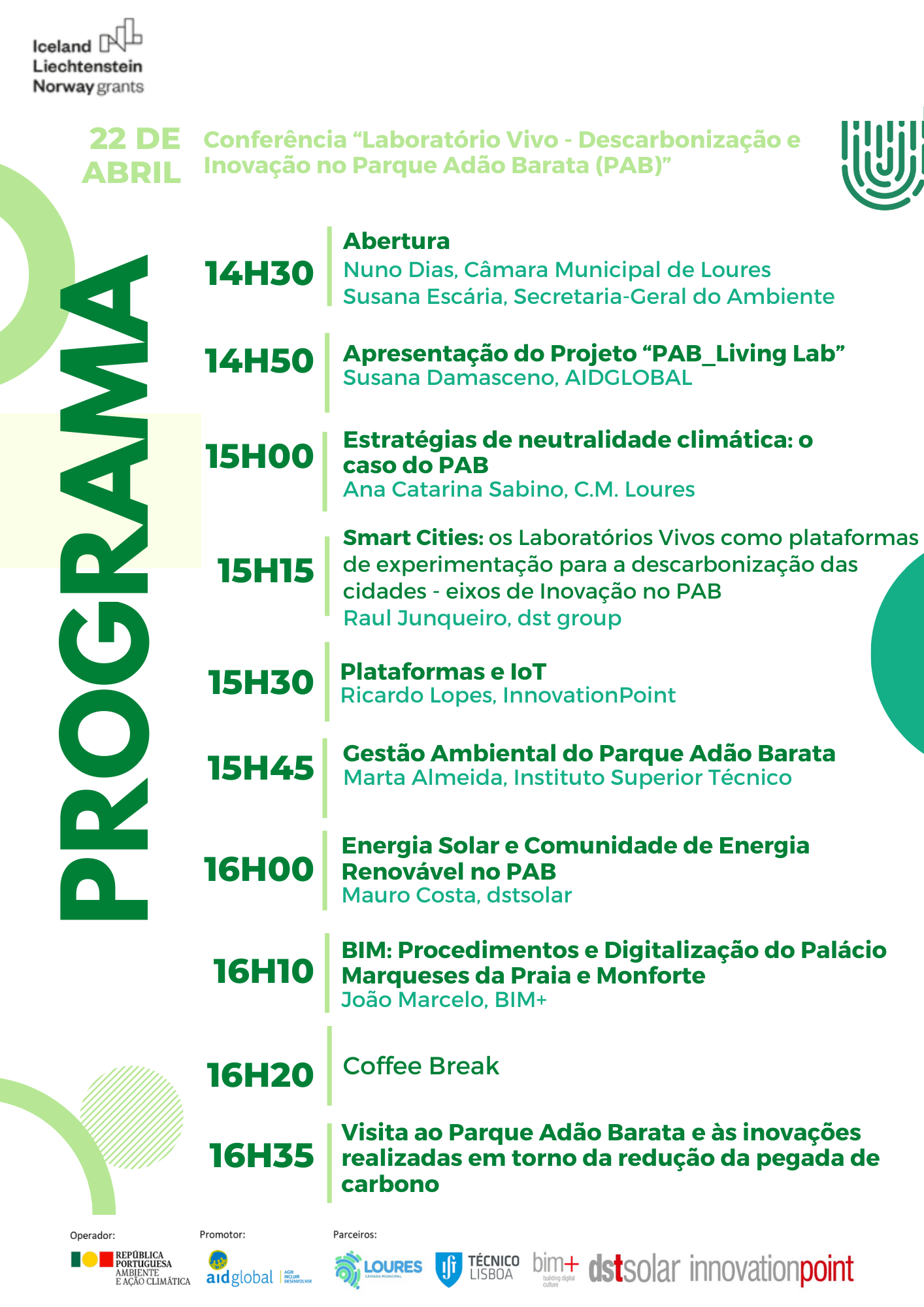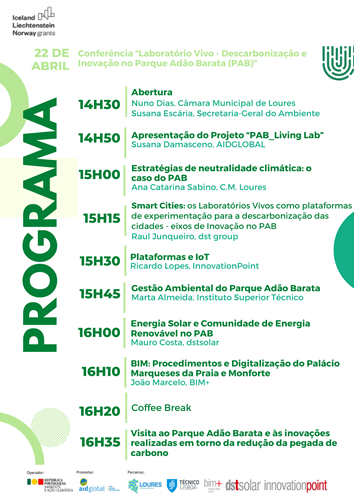 22-04-2024 14:30 22-04-2024 18:00 Parque Adão Barata A Câmara Municipal de Loures e a AIDGLOBAL juntamente com os parceiros do proieto "PAB_LivingLab - Vive a Descarbonização no Parque Adão Barata", convidam-no/a a participar na Conferência final do projeto.