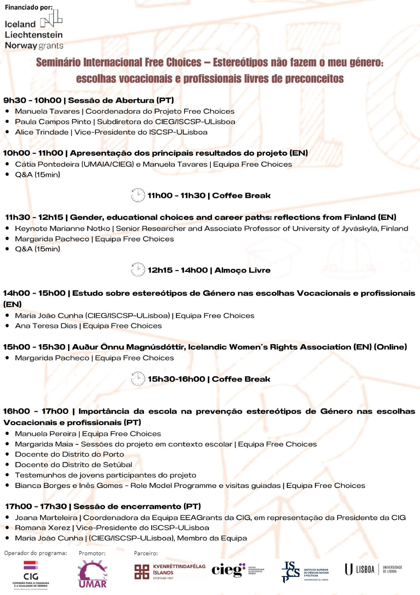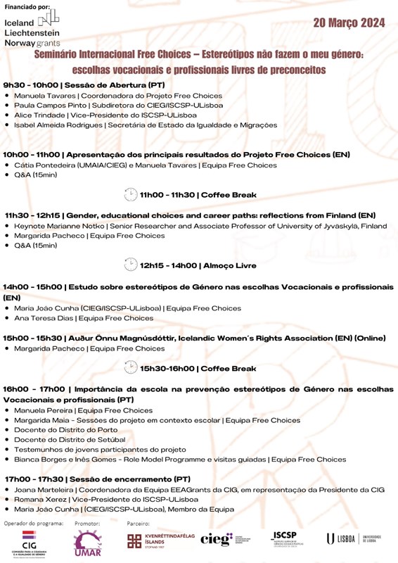 No próximo dia 20 de março de 2024, irá decorrer o Seminário Final do Projeto Free Choices – Estereótipos não fazem o meu género: escolhas vocacionais e profissionais livres de preconceitos, financiado pelo Programa Conciliação e Igualdade de Género EEA Grants 2014-2021, gerido pela Comissão para a Cidadania e a Igualdade de Género (CIG). Este projeto é promovido pela UMAR – União de Mulheres Alternativa e Resposta, em parceria com o Centro Interdisciplinar de Estudos de Género (CIEG/ISCSP-ULisboa).