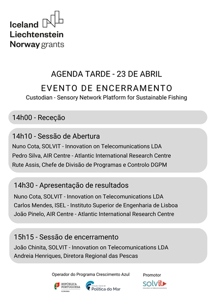 Dia 23 de abril, pelas 14h00 (hora local), no TERINOV, acontece o evento de encerramento e de apresentação de resultados do projeto de I&D em contexto empresarial CUSTODIAN - Sensory Network Platform for Sustainable Fishing.