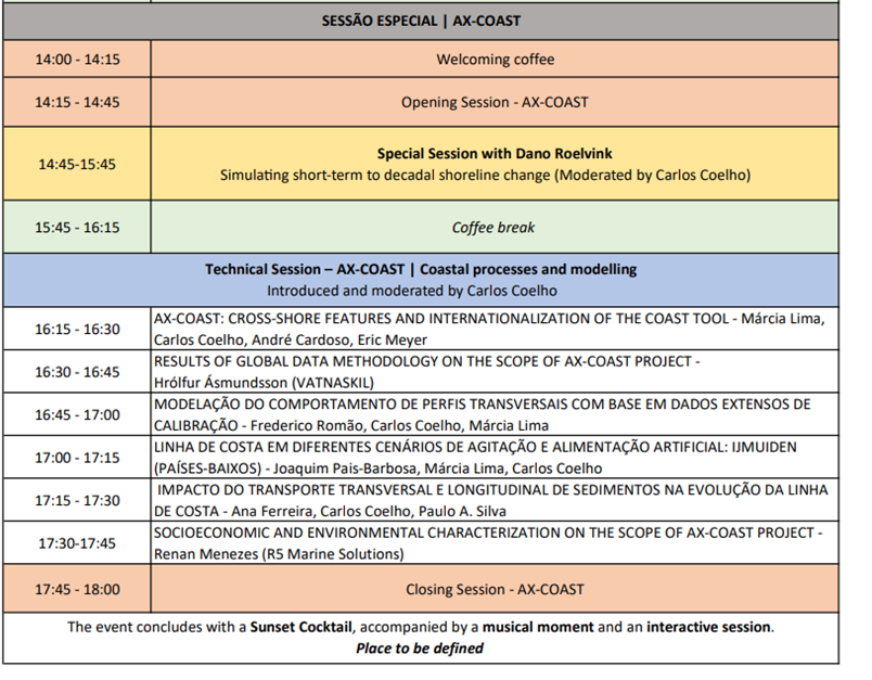 O projeto AX-COAST - Cross-shore features and internationalization of the COAST tool - iniciou em junho de 2022 e tem como objetivo a incorporação dos processos de simulação transversais na ferramenta COAST, e a internacionalização da ferramenta e da metodologia aplicada no projeto COAST4US (que visou contribuir para a mitigação da problemática da erosão costeira em Portugal) a um caso de estudo na Holanda (IJmuiden).