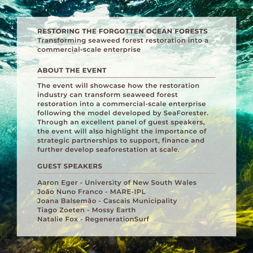 Seguindo o modelo do SeaForester, o evento irá demonstrar como é que o setor comercial consegue transformar a recuperação de florestas marinhas numa iniciativa comercial a larga escala. Através de um excelente painel de oradores, iremos destacar a importância de parcerias para apoiar, financiar e desenvolver ações de reflorestação.