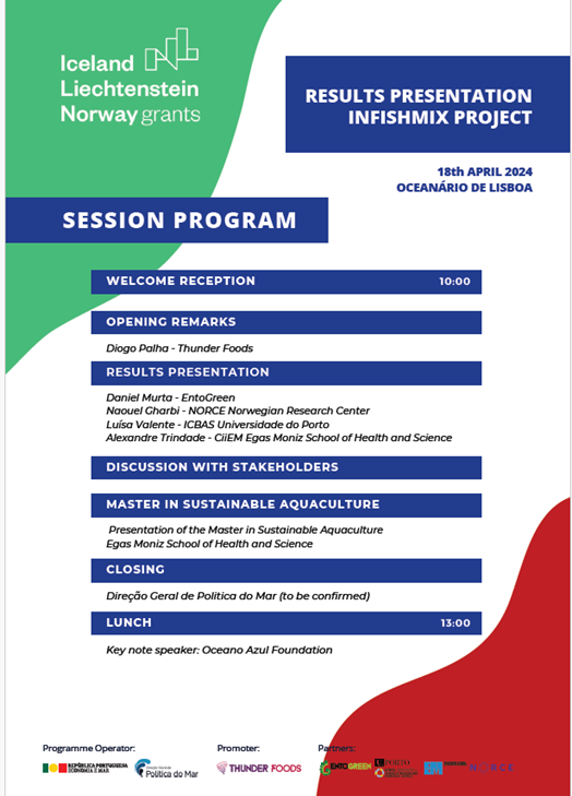 As atividades centrais dizem respeito ao teste da incorporação de um mix de proteínas de inseto (mais sustentáveis que as fontes de proteína animal tradicionais) na dieta de duas espécies, o salmão e o robalo, com resultados bastante interessantes, cuja Sessão de Apresentação de Resultados irá decorrer no próximo dia 18 de abril, pelas 10h30, no Oceanário de Lisboa.