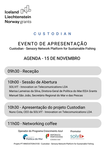 O consórcio liderado pela SOLVIT - Innovation on Telecomunications Lda. e dos parceiros AD AIR Centre, LOTAÇOR S.A., Docapesca S.A., ISEL, Uavision Lda., Norwegian University of Science and Technology e TERINOV, vão promover a sessão de apresentação do projeto Custodian - Sensory Network Platform for Sustainable Fishing, financiado pelo Programa Crescimento Azul dos EEA Grants.
