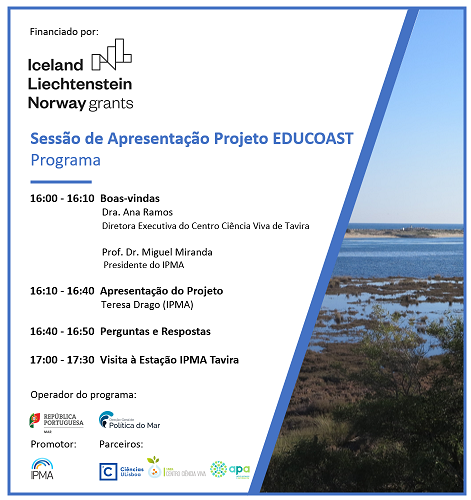 O IPMA irá realizar a sessão de apresentação do Projeto EDUCOAST: “Nature-based education in coastal geosciences – A field station in Southern Portugal, financiado pelo Programa Crescimento Azul, no âmbito do Mecanismo Financeiro EEA Grants 2014-2021. Este projeto tem por objetivo a promoção de aprendizagem de campo e de laboratório na área da Geologia Marinha e Costeira e pretende ser uma mais-valia na aquisição dos conceitos e matérias adquiridas na sala de aula.