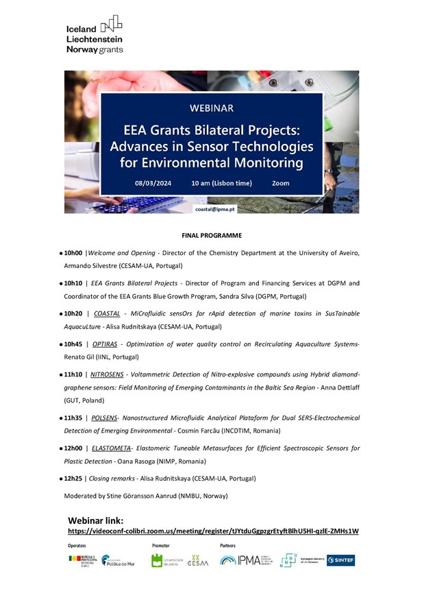 Este Webinar pretende apresentar uma visão geral da investigação na área das tecnologias sensoriais de deteção, com destaque para a monitorização ambiental que é realizada pelos projetos bilaterais financiados pelos EEA Grants Portugal - Blue Growth, EEA Grants Polónia - Applied Research e EEA Grants Roménia - Agência Executiva para o Financiamento do Ensino Superior, da Investigação, do Desenvolvimento e da Inovação (UEFISCDI).